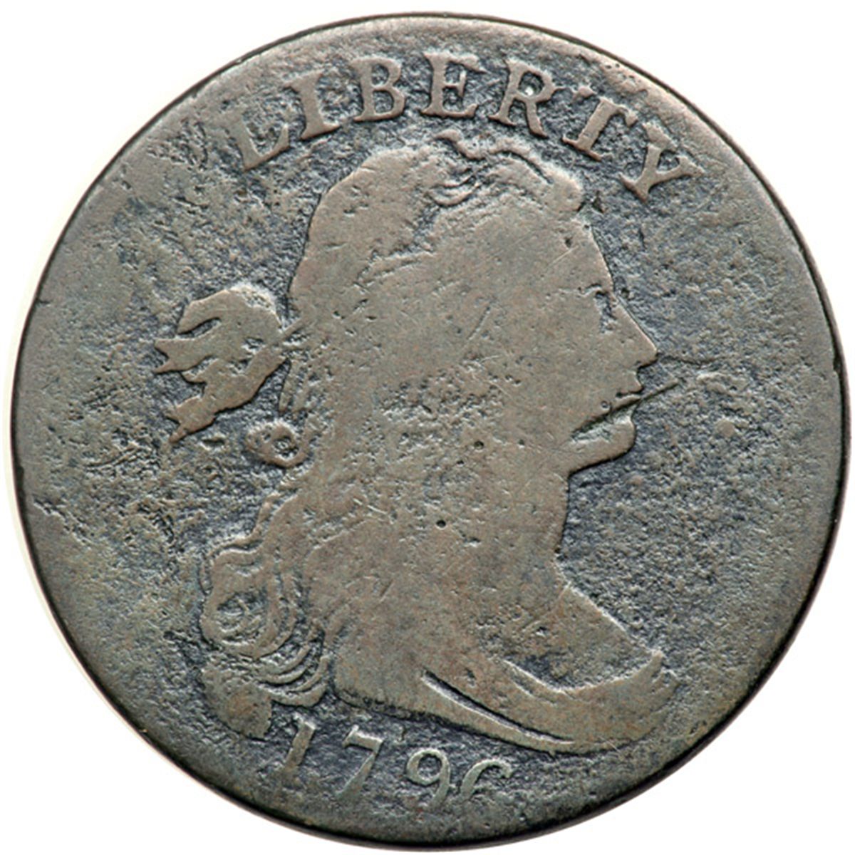 1796 S-110 R3 Draped Bust AG3. Very slightly sharper, particularly on the obverse, but the fields and protected areas are covered with light roughness. No verdigris. A long, dull nick on the chin is the only notable mark. Rather glossy chocolate and olive, the devices a few shades lighter than the fields. The date is clear and the legends are nearly complete. EDS, before any die cracks or cuds.