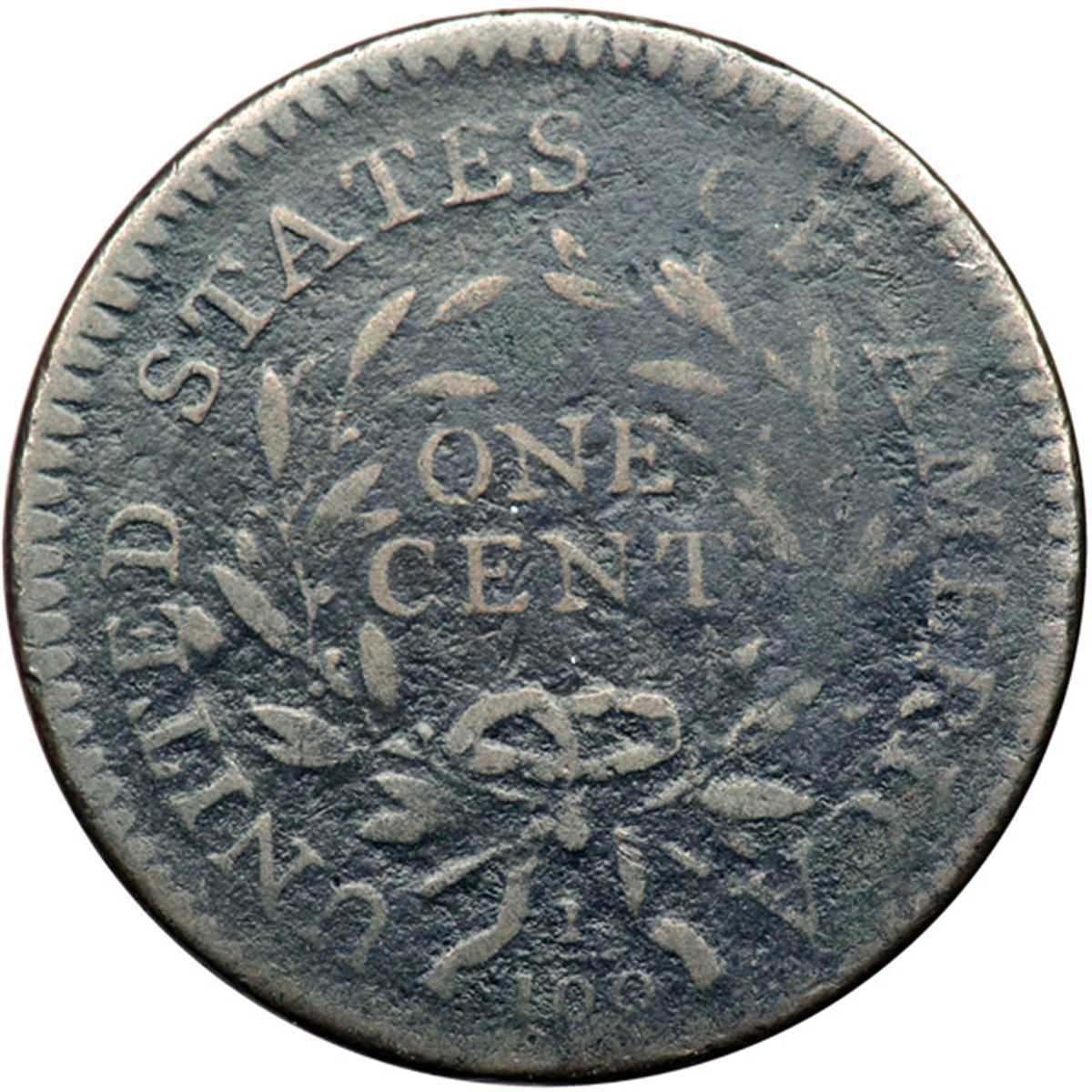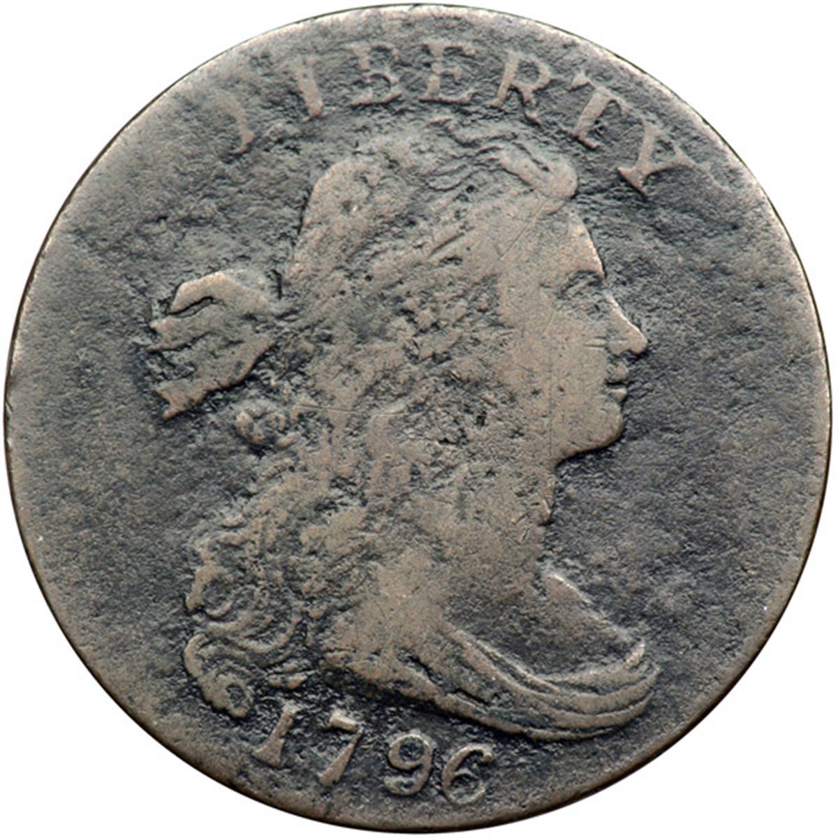 1796 S-110 R3 Draped Bust G6. A couple points sharper but slightly rough under the glossy olive brown and chocolate patina. No verdigris or contact marks. The date is strong and the legends are complete. The reverse is slightly misaligned to K-5 while the obverse is properly centered on the planchet. MDS. A die crack passes through the top of RTY but there is no cud break.