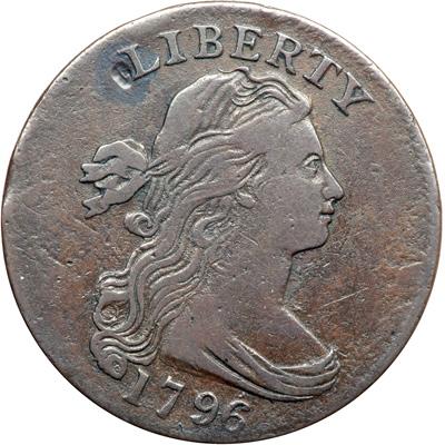 1796 S-110 R3. VG-10. Draped Bust. Slightly sharper with a smoothed pitmark or planchet flake just left of the L in LIBERTY and minor roughness in protected areas, mostly on the reverse. Mostly glossy chocolate brown with darker olive toning at the pitmark near the L. MDS, Breen state V, with minor die cracks at RTY and through the base of the date. The date is strong and the legends are clear.