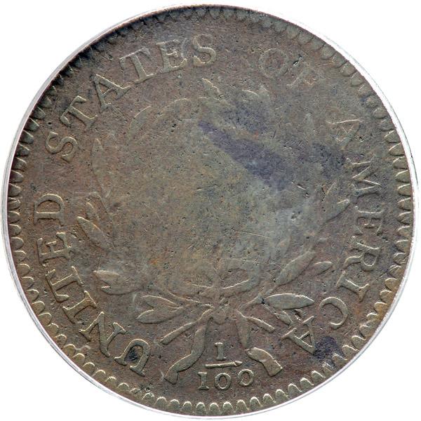 1796 S-111 R5- Draped Bust. PCGS graded VG-8. Mostly glossy light olive and steel brown blending to light chocolate in protected areas. No corrosion or verdigris. The only defects are a few minor contact marks, including a trio of dull nicks or shallow depressions in the hair right of the ribbon. The date and legends are strong except for inside the wreath where minor swelling has virtually eliminated ONE CENT. MDS, Breen state III. Our grade is VG7+, close to VG8.
