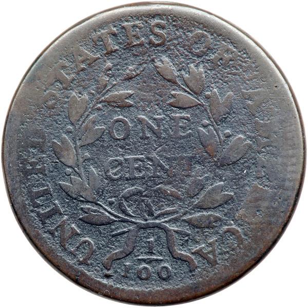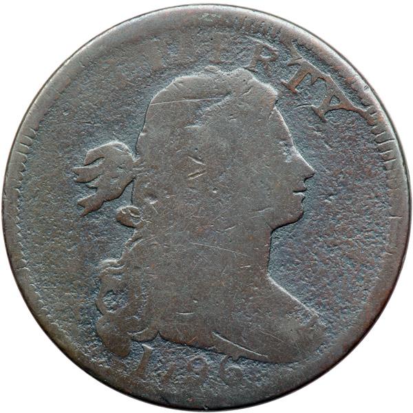 1796 S-114 R5- Draped Bust G4. Slightly glossy dark chocolate brown with darker olive toning in protected areas. The devices are smooth and glossy while the fields are covered with extremely fine granularity that retards the gloss in those areas. No marks or verdigris. The date is easily readable, although the upper part of the 7 is weak, and the legends are clear except for weakness on a few letters. Rare MDS, Breen state II, with a sunken retained cud break at TY. This retained cud break is strong for the grade. A decent example of this difficult intermediate die state.