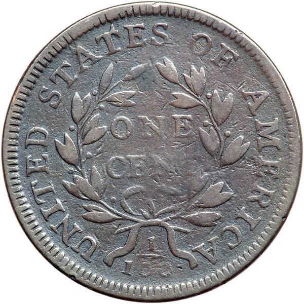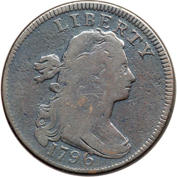 1796 S-114 R5- Draped Bust. VG-7. Glossy chocolate and bluish steel, the devices a shade or two lighter than the protected areas. Probably lightly cleaned but attractive with the details of a slightly higher grade. Nice surfaces displaying only a couple trivial marks, including a speck of carbon at the top of the wreath and a small rim nick over the second S in STATES. EDS, Breen state I, before the die crack at TY. The date is bold and the legends are clear.