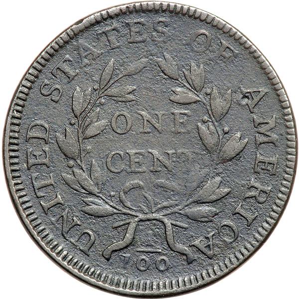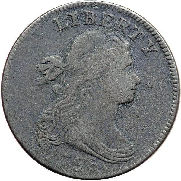 1796 S-115 R3 Draped Bust. VG-8. Sharpness VF20 but dull from uniform fine granularity that covers both sides. No verdigris, and the only mark is a small, round dimple close under the first A in AMERICA. Dark olive and steel. The date and legends are complete and easily readable. E-MDS, Breen state III, before the arc crack through the date.