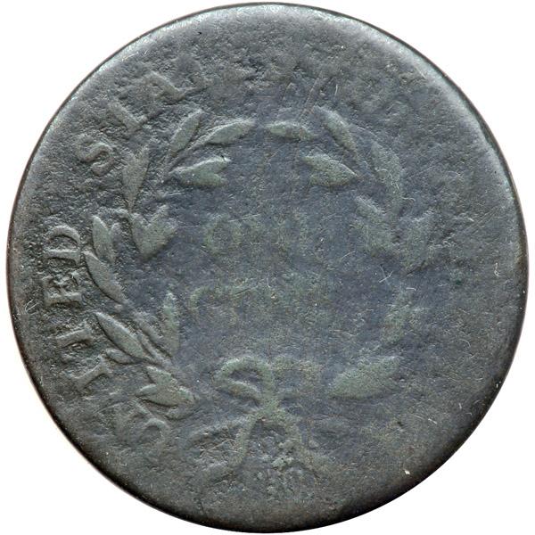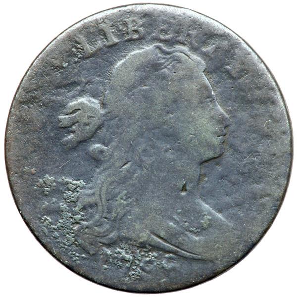 1796 S-116 R5+ Draped Bust AG3. Slightly sharper, especially on the obverse, but the surfaces are uneven from shallow erosion. No verdigris. A small nick on the neck is the only notable mark. Glossy dark steel brown and olive with slightly lighter toning on the highpoints. The date and legends are easily readable except for ONE CENT, AMERICA, and the fraction, which are mostly gone.