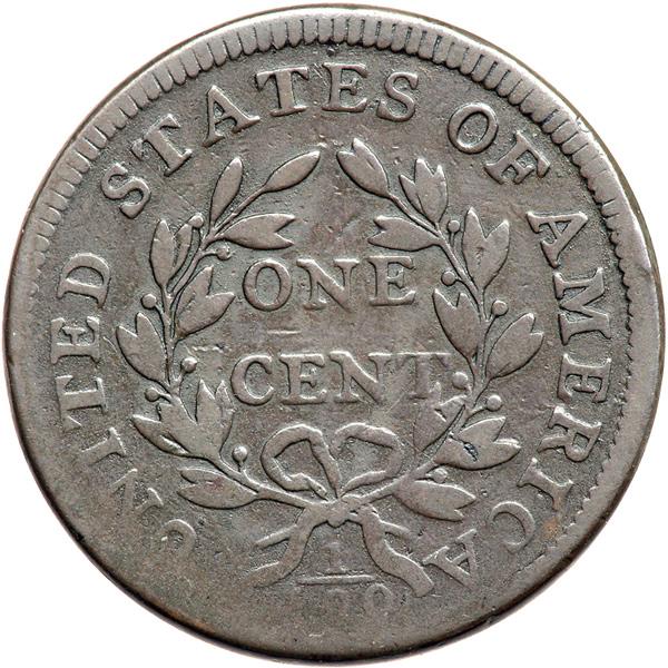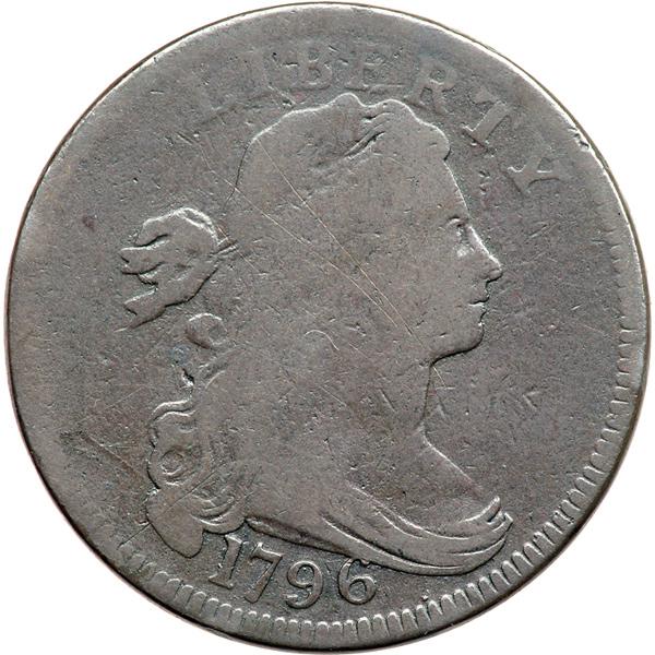 1796 S-118 R5+ Draped Bust. VG-7. Choice glossy chocolate and steel. Smooth and attractive, only a few trivial hairlines on the portrait and a pair of barely visible rim bruises from flawless. Struck with the dies axially misaligned (the die faces were not perfectly parallel) causing strike weakness at the upper left of the obverse and lower left of the reverse while the details across the planchet are stronger than the assigned grade might imply. Nonetheless, the date is strong and the legends are complete. This is a very nice lower-grade example of a variety that seldom comes without significant defects. Called G6 Choice (one of only two examples called "Choice" in his extensive list) and tied for CC#11 in the Noyes census, his photo #24344. Bland calls this piece VG7 in his census. And it comes with a nice provenance.
