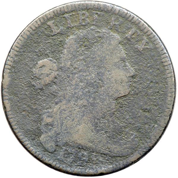 1796 S-119 R3 Draped Bust AG3. Sharpness VG7 but dull from moderate granularity that covers both sides. No marks or notable signs of verdigris. The date is weak from the roughness but is still readable while the legends are complete and clear. Olive brown with slightly lighter steel brown and chocolate toning on the devices.