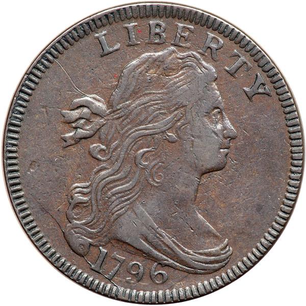 1796 S-119 R3 Draped Bust. VF-35. Glossy steel brown and chocolate with frosty lighter steel brown toning in protected areas. Smooth surfaces offering excellent eye appeal. The only notable mark is a fine hairline scratch from the top of the hair ribbon to the dentils at the left. M-LDS, Breen state III, showing small rim cud breaks at TAT and clear die cracks at the bottom of the obverse. Possibly from the famous Nichols Hoard of mint state 1796 and 1797 cents, but this one saw limited circulation before being preserved for a collector.