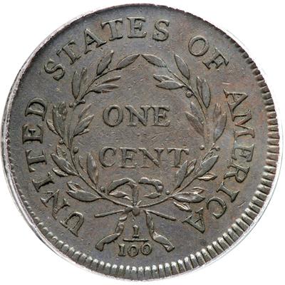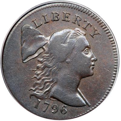 1796 S-81 R3. PCGS graded AU-50. Liberty Cap. Very attractive glossy dark steel brown and chocolate with slightly lighter toning in the protected areas around the portrait and hints of bluish steel overtone on both sides. The surfaces are smooth and offer outstanding eye appeal. The only marks are a thin, barely visible planchet fissure through the top of the cap (as struck), plus a couple even less visible hairline scratches lower on the cap. Nicely struck EDS, Breen state I. ONE CENT is fully impressed, which is uncommon for the Liberty Cap type. Struck very slightly off center to K-7.5, but the legends remain comfortably on the planchet. A premium example in every respect. Our grade is VF30 choice. Pop 6.