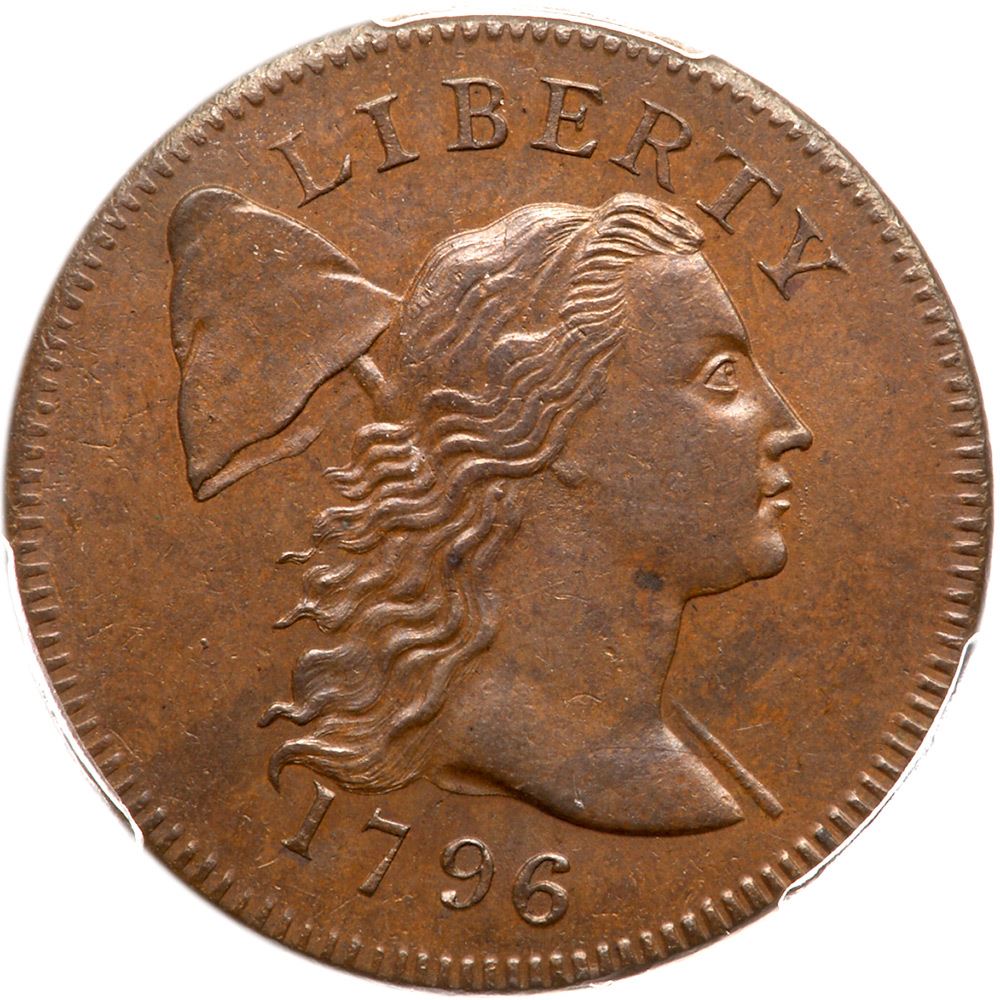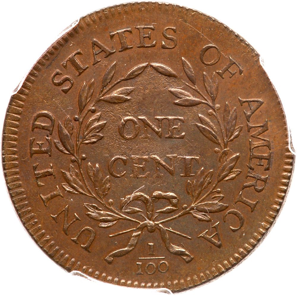 1796 S-84 R3 Liberty Cap PCGS graded MS62 Brown. Very attractive medium steel brown and light chocolate with a hint of light olive on the reverse. Traces of very faded mint red can be found in protected areas on the reverse. Nearly flawless with superior eye appeal. The only marks are a faint spot of slightly darker toning on the throat, some very shallow low spots caused by debris on the die inside the wreath, and a pre-striking hairline scratch in the planchet over ST in STATES. MDS, Breen state II. There is a very fine die crack arcing across the bust and a slightly stronger crack through the top of OF to the dentils over the adjacent ES. Graded MS60 net AU55 and tied for CC#5 in the Noyes census, his photo #29240. Bland says AU55 and tied for CC#7. Our grade is AU58. A beautiful Liberty Cap cent that comes with a great provenance. The attribution is noted on the PCGS Secure label. PCGS population 1; 2 finer in 64. PCGS #35759. Estimated Value 20,000 - UP