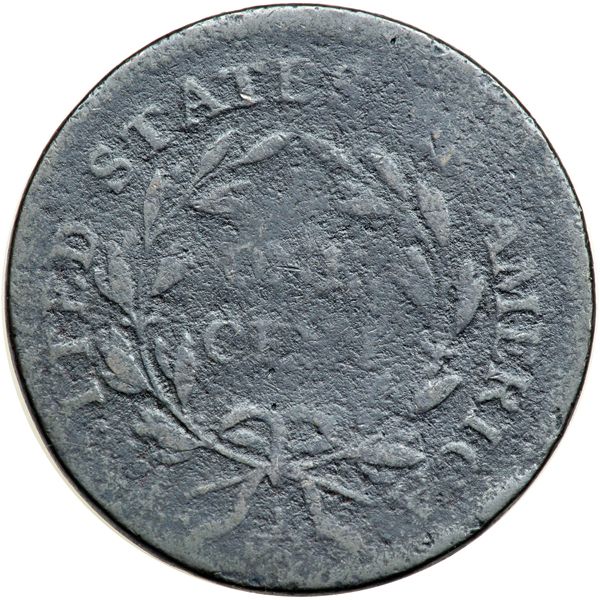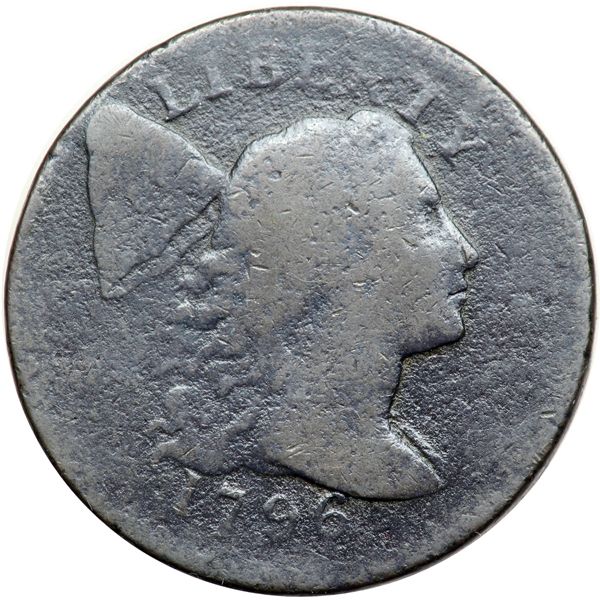 1796 S-89 R3 Liberty Cap G4. A couple points sharper but covered with light roughness. No marks or verdigris. The date is clear and the legends are nearly complete. Rather glossy dark chocolate brown and olive. Struck slightly off center to K-10.5.