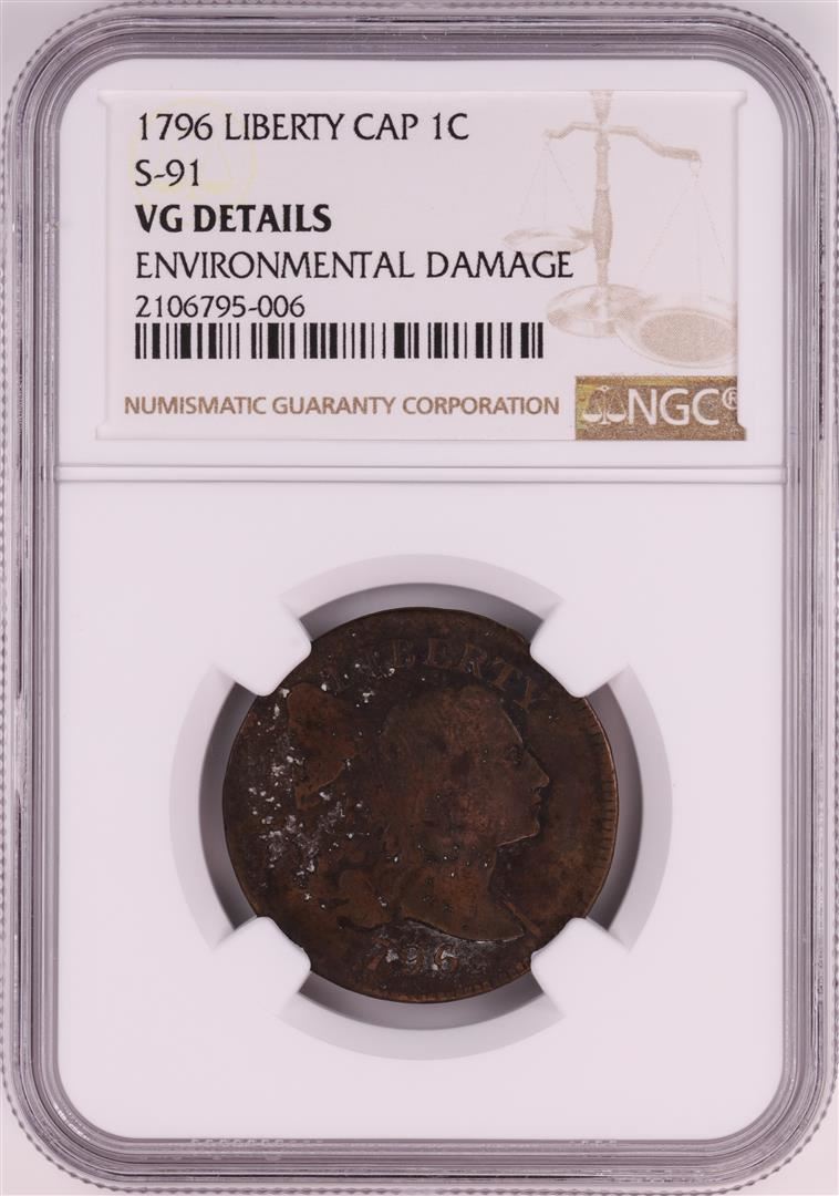 One 1796 S-91 Liberty Cap Large Cent Coin NGC VG Details. NGC Certified.