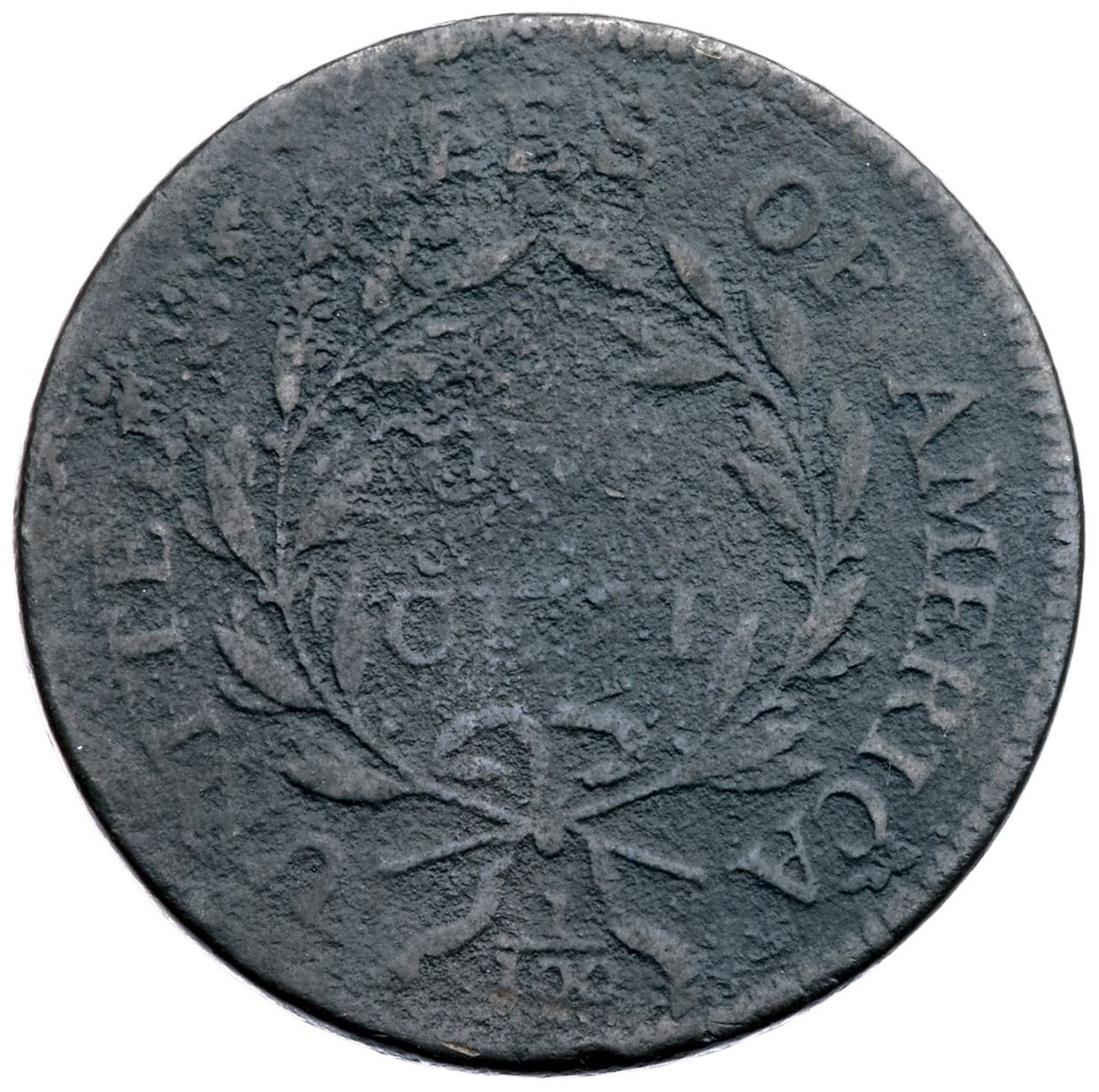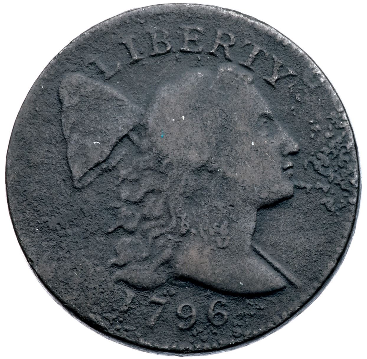 1796 S-91 R-3 G4VG10 sharpness but corroded with fine to moderate roughness on the surfaces. Semi-glossy dark brown and steel surfaces. Bold date and LIBERTY, mostly readable reverse legends. MDS. Ex; W.R.T. Smith 11/1975