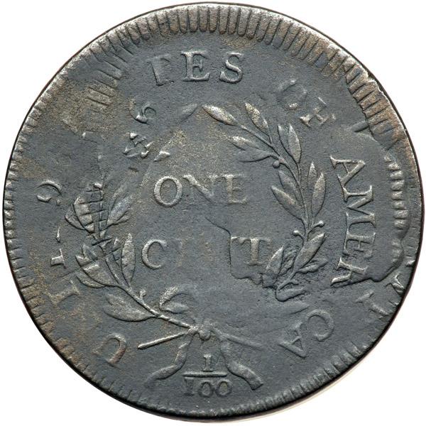 1796 S-91 R3 Liberty Cap VG10. Flipover Triple Strike with 3 Dates. Sharpness VF20 but covered with microscopic porosity, strongest on the reverse. No marks or verdigris. Slightly glossy dark steel and olive blending into dark chocolate. This cent was struck three times and (remarkably) all 3 of the dates remain visible. One strike (probably the first) was nearly centered on the planchet. Another strike (probably the second when the struck cent failed to eject completely) was about 30% off center. A third strike (probably the last) was centered on the planchet after it was flipped over. This third strike left the dominant impression on both sides, but strong evidence of the first two impressions remains. This includes three dates, one on the "obverse" and two on the "reverse." In addition to the "796" under the portrait on the dominant obverse, another "796" is visible at the D in UNITED and a third "96" is visible under AT in STATES. Much additional undertype is visible on both sides. This one is worth examining just for the enjoyment of studying such an egregious mint error.