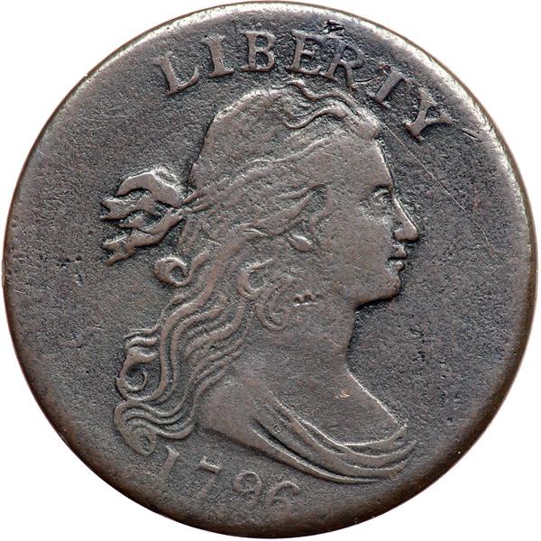 1796 S-92 R3 Draped Bust. Fine-12. Sharpness VF20 but the fields and protected areas are covered with very fine roughness, strongest on the reverse. No verdigris, and the only marks are a tiny dig over the left edge of the R in LIBERTY and a faint hairline scratch in the field before the forehead. Slightly glossy dark steel and olive brown with chocolate toning on the highpoints. The date and legends are complete and clear. E-MDS, Breen state II.