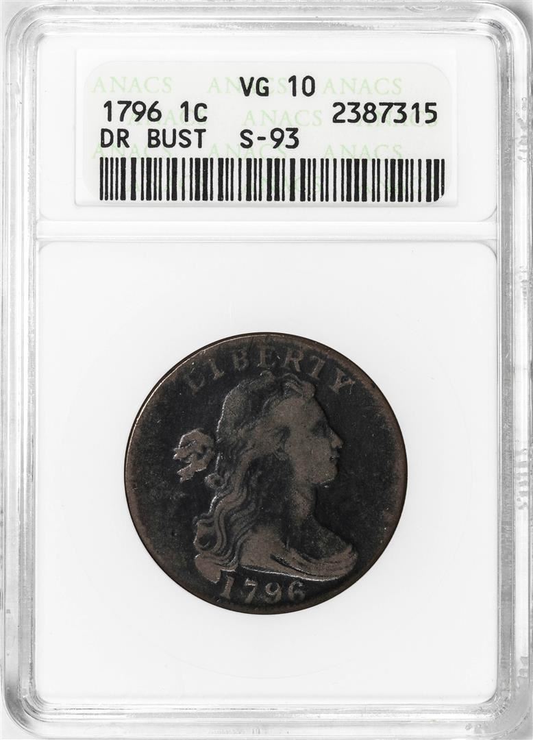 One 1796 S-93 Draped Bust Large Cent Coin ANACS VG10. ANACS Certified.