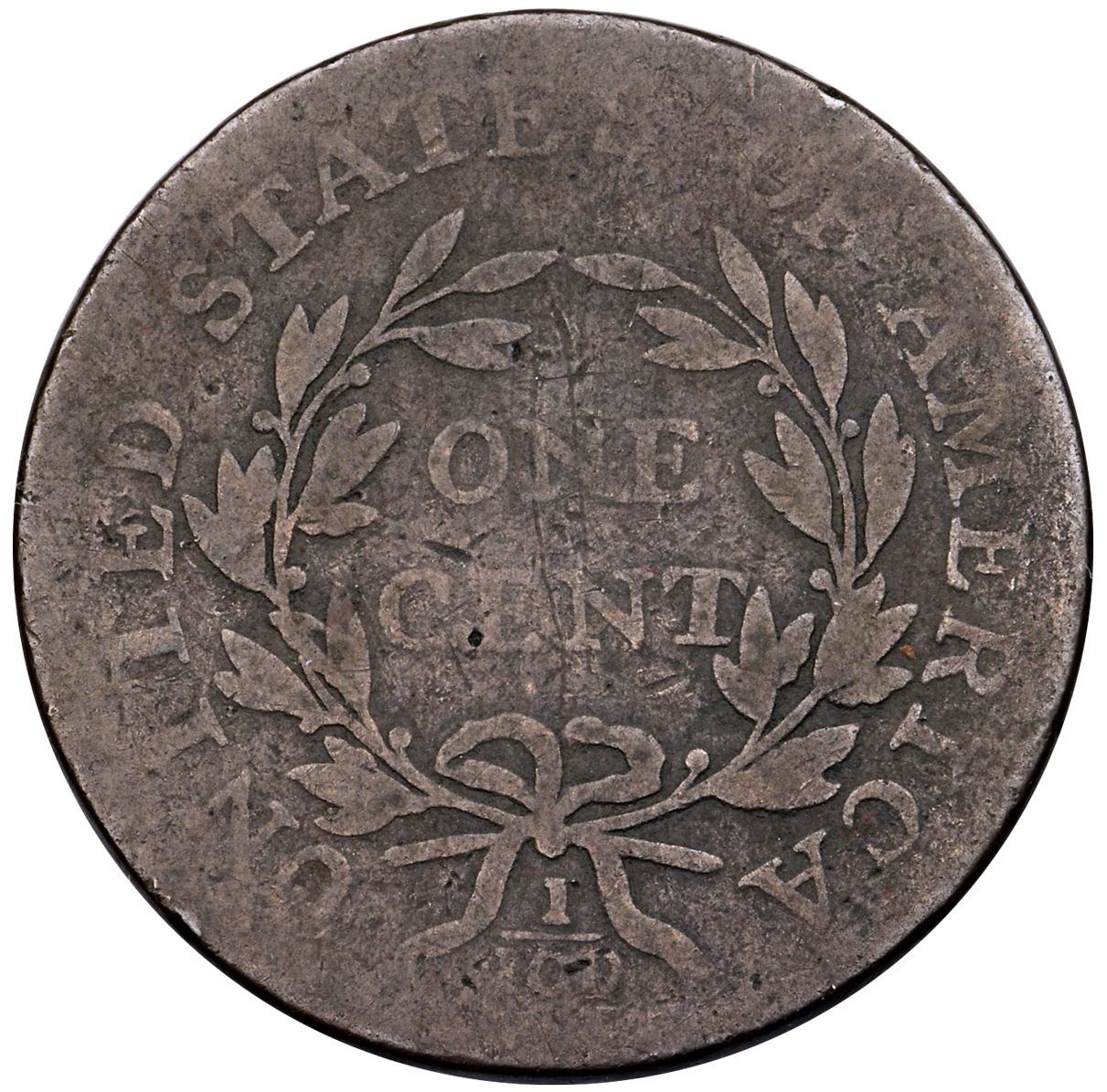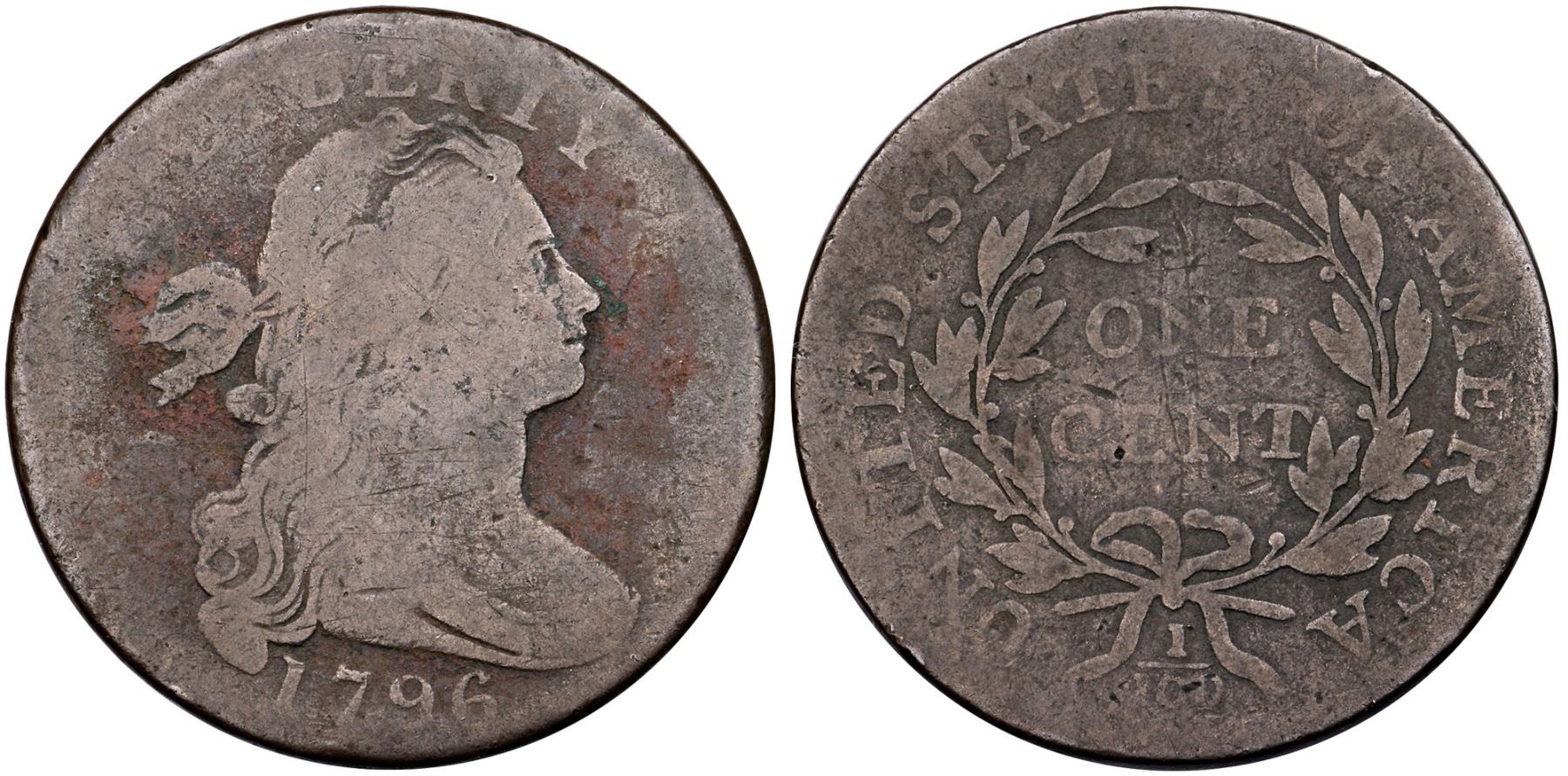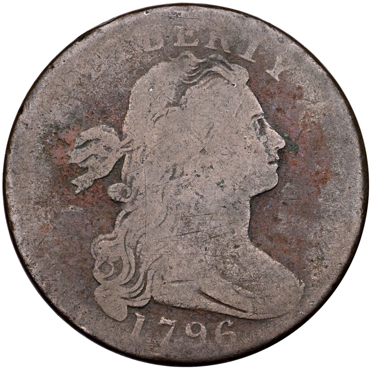 1796 S-95 R-5+ Draped Bust AG3+A point or two sharper but there is very fine roughness in the fields and protected areas while the highpoints are smooth. Traces of shallow reddish verdigris show in the field along the profile and around the hair ribbon. The only contact marks are some fine vertical hairline scratches through the center of the reverse. Slightly glossy chocolate and olive brown. The date and legends are easily readable but some letters are weak. Not perfect but still very close to net G4. Ex Kevin Vinton- the Clackamas Collection - EAC Sale 2024:241 - Doug Durasoff