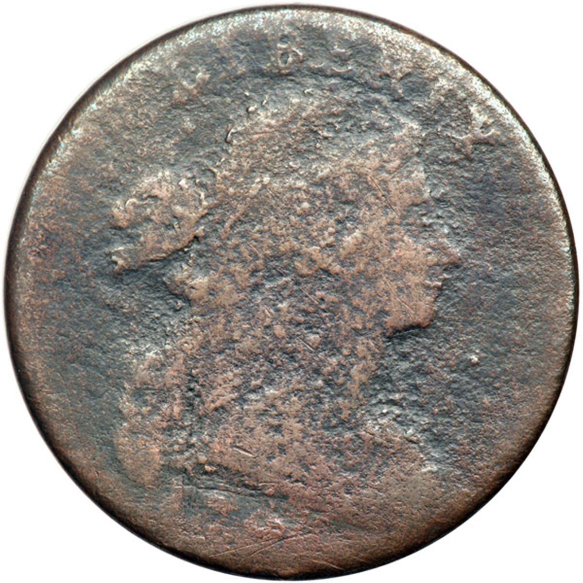 1796 S-95 R5+ Draped Bust AG3. Slightly sharper, especially on the reverse, but covered with uniform moderate roughness that obscures many of the details. The date is readable although the 6 is very weak, and the legends are complete and easily readable in spite of some weaknesses. Rather glossy dark olive brown and chocolate with lighter steel brown highpoints.