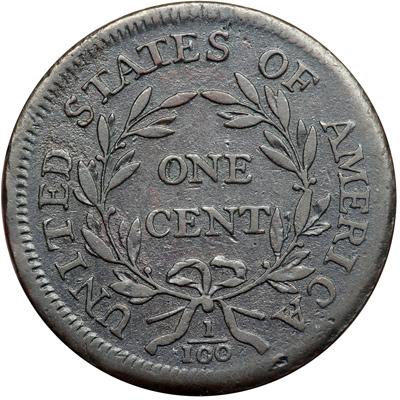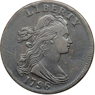 1796 S-97 R3+ Draped Bust. Fine-15. Misaligned Dies. Five points sharper with a couple fine hairline scratches down the neck, another short one in the field left of the middle curls, and some fine porosity at ED-ST on the reverse. Otherwise the planchet and surfaces are very attractive for the grade. Glossy chocolate brown with slightly lighter steel brown toning on the highpoints. EDS, Breen state I, with both dies unbroken. However, the dies are misaligned in different directions on both sides. The obverse is off center to K-9 while the reverse is off by a greater amount to K-3.5, but the date and legends are still completely on the planchet. Called VF30 net F15 and tied for CC#10 in the Noyes census, his photo #26749. Nice eye appeal in spite of the minor defects. Removed from an NCS slab graded VF details with the obverse scratched (NCS label included, and it shows the attribution and Reiver provenance). DWH #2859.