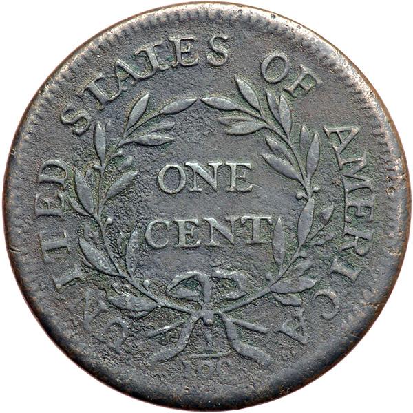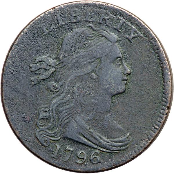1796 S-97 R3 Draped Bust. VG-10. Sharpness VF30 but dull and covered with microscopic roughness. There are traces of hard greenish patina in a few protected areas on the reverse, but the remainder of the planchet is free of verdigris. The only mark is a tiny rim nick at I in LIBERTY. Dark olive and steel. M-LDS, Breen state IV, with a strong die crack through the top of RTY causing a slightly sunken retained cud break above those letters. In addition the obverse is slightly misaligned to K-9. The date and legends are complete and clear.