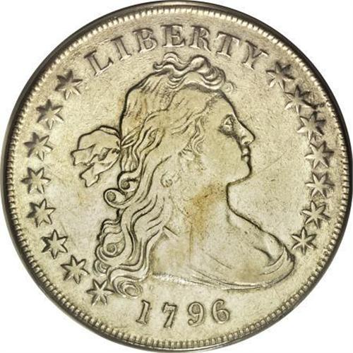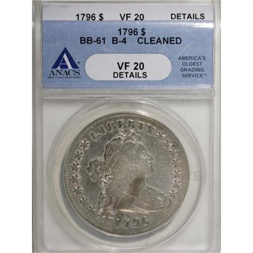 <B>1796 $1 Small Date, Large Letters--Cleaned--ANACS. VF20 Details.</B></I> B-4, BB-61, R.3. This Small Eagle type coin is somewhat bright, but has begun to retone honey-gold on Liberty's neck and shoulder. The reverse has blushes of charcoal-gray between 5 and 10 o'clock. The eagle's feathers retain noticeable plumage detail.<BR><BR><B>Coin Engraver:</B> Robert Scot<BR><BR><b>Shipping:</b> Coins & Currency (<a target="_blank" href="http://www.heritageauctions.com/common/shipping.php">view shipping information</a>)
