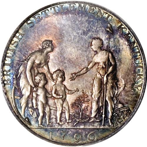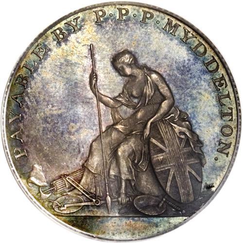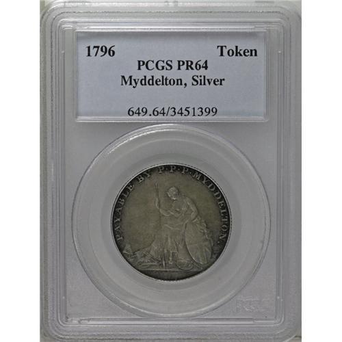 <B>1796 TOKEN Myddelton Token, Silver PR64 PCGS.</B></I> Breen-1073. English resident Philip Parry Price owned a large land holding in Kentucky, which had recently entered the Union in 1792. Myddelton planned to form a farming community there, stocked with English immigrants. He enlisted Matthew Boulton's private Soho Mint to produce pattern tokens in silver and copper. The <I>Guide Book</B></I> values both varieties equally at $20,000 in proof condition. The designs for the token are generally acknowledged as artistically superior, and among the best of the various Early American issues. Myddelton's plans for his Kentucky community went awry when he was jailed in England for his efforts. This piece is beautifully toned in electric-blue, orange, and olive tones, and is smooth aside from a few faint abrasions on the central obverse field. Listed on page 73 of the 2007 <I>Guide Book.</B></I><BR><I>From The Jones Beach Collection.</B></I><BR><BR><b>Shipping:</b> Coin/Currency (<a target="_blank" href="http://www.heritageauctions.com/common/shipping.php">view shipping information</a>)