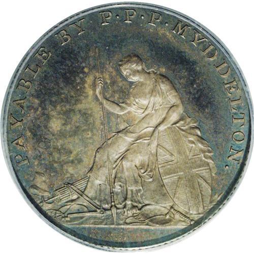 <B>1796 TOKEN Myddelton Token, Silver PR64 PCGS.</B></I> Breen-1073. Beautiful autumn-brown and forest-green toning drapes this needle-sharp and moderately mirrored specimen, which ranks among the finest certified. Thorough evaluation with the aid of a strong lens locates a few wispy field marks, but these are inconsequential relative to the exemplary eye appeal. English citizen Philip Parry Price Myddelton planned a community on his Kentucky estate, and solicited Boulton & Watt to strike silver and copper patterns. Myddelton's plans were interrupted by English authorities, who imprisoned him under the charge of "enticing artificers to emigrate to the United States," per Breen. Listed on page 73 of the 2007 <I>Guide Book.</B></I> Population: 3 in 64, 1 finer (10/06).<BR><I>From The Troy Wiseman Collection, Part Two.</B></I><BR><BR><b>Shipping:</b> Coin/Currency (<a target="_blank" href="http://www.heritageauctions.com/common/shipping.php">view shipping information</a>)