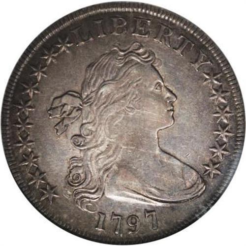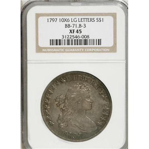 <B>1797 $1 10x6 Stars XF45 NGC.</B></I> B-3, BB-71, R.2. The only variety with an obverse arrangement of 10x6 stars. Because of the extra left-side stars, LIBERTY is placed further to the right than usual, and has an unbalanced appearance relative to the bust. This is a problem-free example with undisturbed rims and minimal contact. Liberty's hair is well defined, and wear is mostly confined to the eagle's breast and Liberty's cheek and shoulder. Luster emerges from design elements, and the dusky steel-gray and autumn-gold toning appears original. NGC BB-71 Census: 16 in 45, 20 finer (11/07).<BR><I>From The Parker Lee III Collection.</B></I><BR><BR><B>Coin Engraver:</B> Robert Scot<BR><BR><b>Shipping:</b> Coins & Currency (<a target="_blank" href="http://www.heritageauctions.com/common/shipping.php">view shipping information</a>)