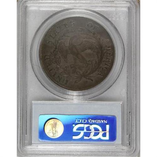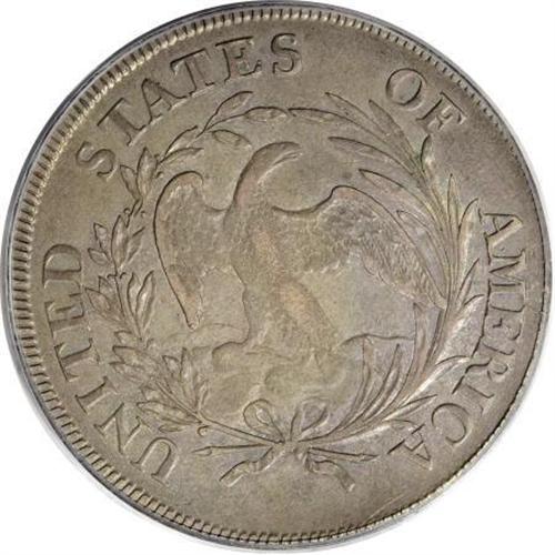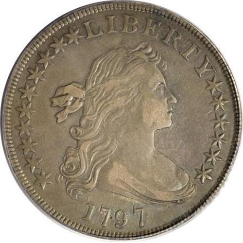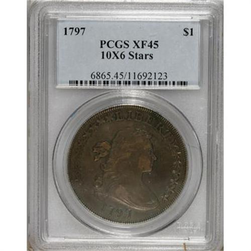 <B>1797 $1 10x6 Stars XF45 PCGS.</B></I> B-3, BB-71, R.2. Bowers-Borckardt Die State III with lapped right edges on the palm branch leaves. Deep forest-green, powder-blue, and gunmetal-gray toning drapes this relatively unabraded early dollar. Liberty's cheek and shoulder display wear, but the eagle possesses partial breast feathers.<BR><BR><b>Shipping:</b> Coins & Currency (<a target="_blank" href="http://www.heritageauctions.com/common/shipping.php">view shipping information</a>)