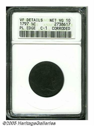 <B>1797<1/2 C> 1 Above 1--Corroded--ANACS. VF Details, Net VG10.</B></I> B-1, C-1, R.2. All legends are legible aside from the ICA in AMERICA. A dark and rough example that has a minor rim ding at 7:30 on the obverse.
