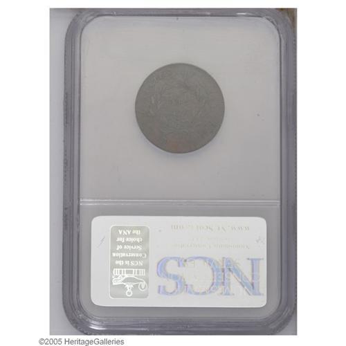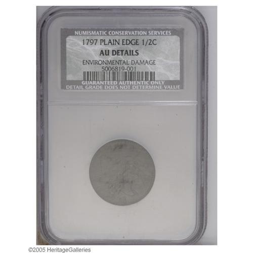 <B>1797<1/2 C> 1 Above 1--Environmental Damage--NCS. AU Details.</B></I> B-1, C-1, R.2. MDS 4.0. Not the final die state, since Liberty's nose is clear, but the obverse network of die cracks is impressive. The reverse is about 50% occupied by areas of tan-brown or ebony verdigris, but these do not affect design detail. The rest of the piece is smooth and possesses dark brown toning. A richly detailed Half Cent with some faint roller marks on the upper left reverse border and a faint handling mark near the C in AMERICA.
