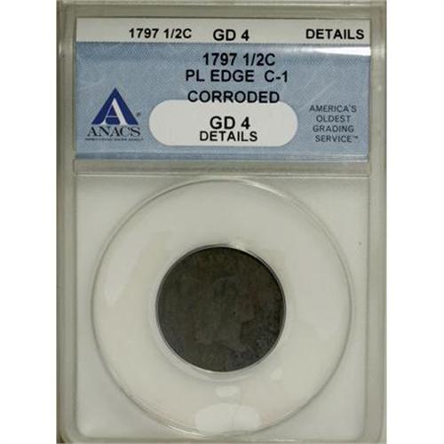<B>1797 1/2 C 1 Above 1, Plain Edge--Corroded--ANACS. Good 4 Details.</B></I> C-1. NGC Census: (0/31). PCGS Population (3/50). Numismedia Wsl. Price for NGC/PCGS coin in G4 : $360. (#1042)<BR><BR><B>Coin Engraver:</B> John Smith Gardner<BR><BR><b>Shipping:</b> Coins & Currency (<a target="_blank" href="http://www.heritageauctions.com/common/shipping.php">view shipping information</a>)