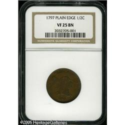 <B>1797 1/2 C 1 Above 1 VF25 NGC.</B></I> B-1, C-1, R.2. Manley Die State 3.0. The chocolate-brown fields complement the slightly deeper tan-brown devices. A charming piece, untroubled for the grade. HALF is somewhat weak, all remaining legends are sharp, as are most of the denticles. Lot:5078