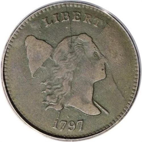 <B>1797 1/2 C 1 Above 1--Corroded, Cleaned--ANACS. VF30 Details.</B></I> C-1, B-1, R.2. This variety shows a thin 1 above the 1 in the date, dot-like defects above both 7's, and five berries on the left branch and three on the right. The later die state features a bulge left of the L in LIBERTY, a die crack from the right side of B into the hair, another from the nose to 4 o'clock, and one from the latter crack to the lower throat. Olive-brown surfaces exhibit sharply defined design features, and reveal minor, insignificant roughness in the right obverse field and in some of the interstices of the wreath. This is a rather pleasing coin, devoid of mentionable abrasions or hairlines. The ANACS disclaimer should not dissuade prospective bidders. EAC 15.<BR><I>From The John Stimson, Sr. Collection, Part Two.</B></I><BR><BR><B>Coin Engraver:</B> John Smith Gardner<BR><BR><b>Shipping:</b> Coins & Currency (<a target="_blank" href="http://www.heritageauctions.com/common/shipping.php">view shipping information</a>)