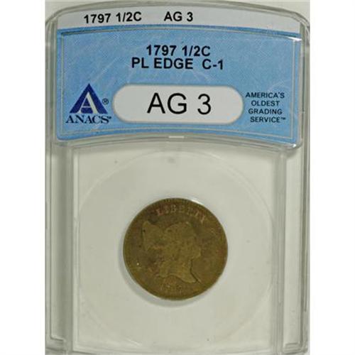 <B>1797 1/2 C Plain Edge AG3 ANACS.</B></I> C-1. NGC Census: (1/36). PCGS Population (3/112). Mintage: 127,840. Numismedia Wsl. Price for NGC/PCGS coin in AG3 : $209. (#1036)<BR><BR><B>Coin Engraver:</B> John Smith Gardner<BR><BR><b>Shipping:</b> Coins & Currency (<a target="_blank" href="http://www.heritageauctions.com/common/shipping.php">view shipping information</a>)