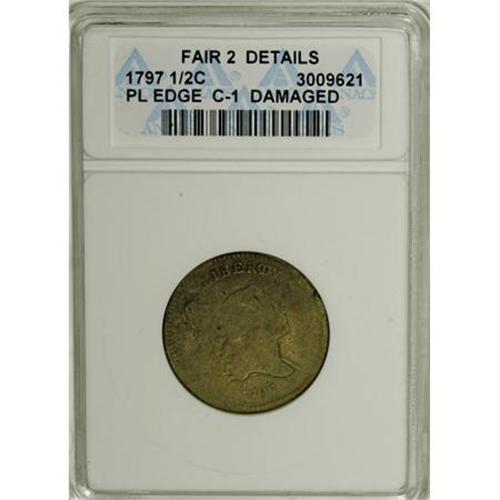 <B>1797 1/2 C Plain Edge--Damaged--ANACS. Fair 2 Details.</B></I> C-1. NGC Census: (1/37). PCGS Population (1/115). Mintage: 127,840. Numismedia Wsl. Price for NGC/PCGS coin in F2 : $120. (#1036)<BR><BR><B>Coin Engraver:</B> John Smith Gardner<BR><BR><b>Shipping:</b> Coins & Currency (<a target="_blank" href="http://www.heritageauctions.com/common/shipping.php">view shipping information</a>)