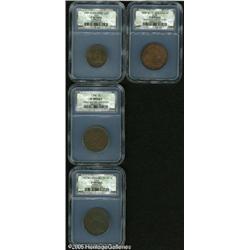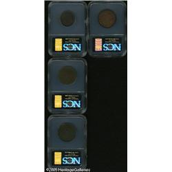 <B>1797 1/2 C  Plain Edge Half Cent Fine Details, Corroded, NCS,</B></I> B-2, C-2, R.3, a rough example, most legends are apparent, a few faint pinscratches on the portrait; <B>1794 Head of 1794 Cent VF Details, Corroded, Obverse Scratched, NCS,</B></I> S-63, Low R.3, the 'Fallen 4' variety, a porous light brown piece, a couple of vertical pinscratches on the portrait; <B>1797 Reverse of 97 No Stems Cent Fine Details, Damaged, NCS,</B></I> S-131, High R.2, granular and wavy, rims have occasional damage, a few obverse pinscratches; and an <B>1800 80/79 Second Hair Style Cent Good Details, Damaged, Improperly Cleaned, NCS,</B></I> S-196, R.1, severely cleaned to bright orange color, light marks on the right obverse field.<BR><I>From The Mike Jacobson Collection.</B></I> 4 Coins   Lot:5077