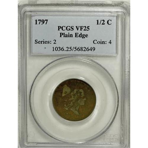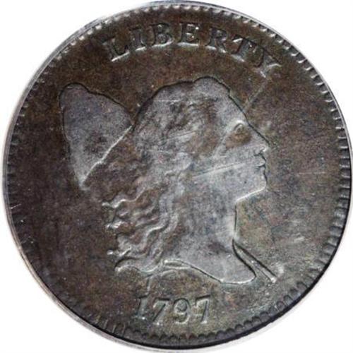 <B>1797 1/2 C 1 Above 1 VF25 PCGS.</B></I> C-1, B-1, R.2. The popular 1 over 1 variety is easily recognized at a glance, with a complete digit 1 between the bust and final date position. PCGS assigned the wrong coin number to this piece, identifying it as a "Plain Edge" variety, that description usually reserved for examples of the C-2 die marriage. The surface have faint evidence of corrosion on the reverse. Attractive steel-brown color is intermingled with olive and reddish-tan. EAC 12.<BR><I>From The Beau Clerc Collection.</B></I><BR><BR><B>Coin Engraver:</B> John Smith Gardner<BR><BR><b>Shipping:</b> Coins & Currency (<a target="_blank" href="http://www.heritageauctions.com/common/shipping.php">view shipping information</a>)