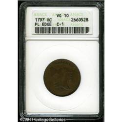1797 1/2 C Plain Edge VG10 ANACS. B-1, C-1, R.2. A <B>1797 1/2 C Plain Edge VG10 ANACS.</B></I> B-1, C-1, R.2. All legends are clear aside from the ICA in AMERICA and ONE CENT. A medium-brown example with several relatively unimportant marks on the obverse visible at certain angles. Certainly a worthwhile type coin. <BR><BR><B>Important notice:</B> Heritage usually auctions material at the rate of 200-250 lots per hour. On some occasions eBay Live bid software or the Internet may not be able to keep up with the pace of the auction. We recommend placing a realistic absentee bid now as insurance to avoid disappointment. Occasionally the auctioneer may eliminate or reject an eBay Live bid, and the auctioneer may also reopen a lot after the close of the eBay live bidding (usually because we missed an audience bid), and may reject your bid even if it shows you as the winning bidder. By bidding via eBay Live, you agree that Heritage may award the lot to another bidder at its sole discretion under the circumstances described above or any other reasonable circumstances. Since eBay bids are not shown to us until we open the lot on the floor, we treat those bids just like floor bids. In most cases the floor responds before the eBay bid is presented to us, due to Internet lag time, so for consistency we have made it a policy that floor bids are always considered first over tie eBay live bids. Also please note that all Heritage lots purchased through eBay Live carry a 20% Buyer's Premium. Please make sure you read the Terms and Conditions before you bid. This lot is being auctioned in conjunction with a live floor auction by Heritage Galleries & Auctioneers. All final auction and invoice information will be supplied by Heritage Galleries & Auctioneers, and all other information should be considered preliminary. Lot:5012
