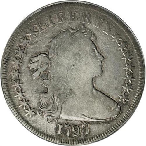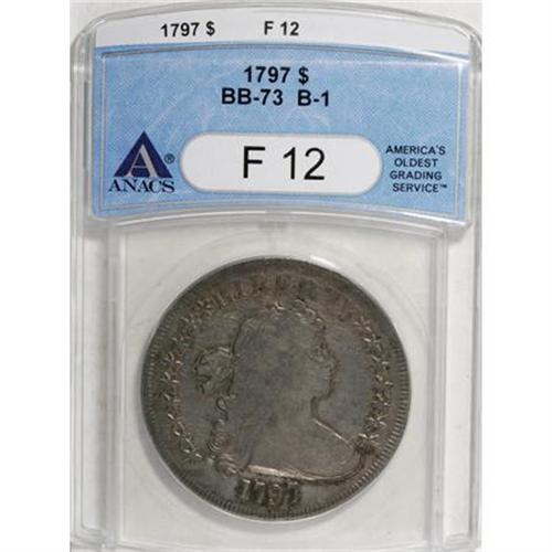 <B>1797 $1 9x7 Stars, Large Letters Fine 12 ANACS.</B></I> B-1, BB-73, R.3. Nine stars left and seven right, and a leaf ends under the center of the upright of E in STATES. Natural steel-gray surfaces are remarkably clean for a moderately circulated, large silver coin. The detail on the perfectly centered design features confirms the Fine grade designation. A very nice Draped Bust Small Eagle dollar that is sure to please the new owner.<BR><BR><B>Coin Engraver:</B> Robert Scot<BR><BR><b>Shipping:</b> Coins & Currency (<a target="_blank" href="http://www.heritageauctions.com/common/shipping.php">view shipping information</a>)