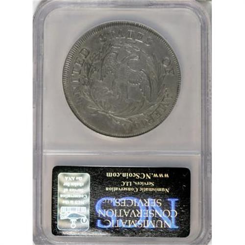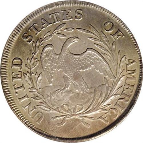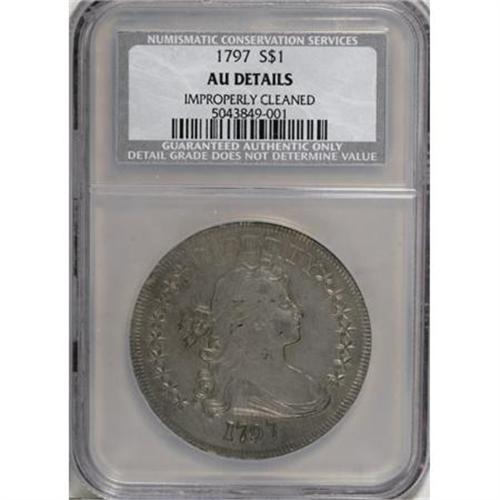 <B>1797 $1 9x7 Stars, Large Letters--Improperly Cleaned--NCS. AU50 Details.</B></I> B-1, BB-73, R.3. A sharp representative with only slight wear on the eagle's breast and front leg. Luster is subdued but extensive. The streaky chestnut and dove-gray surfaces are minutely granular, but relatively devoid of identifying marks. A couple of tiny obverse rim nicks between 10 and 12 o'clock, and a minor ding at 2:30 on the reverse, barely require individual mention.<BR><BR><B>Coin Engraver:</B> Robert Scot<BR><BR><b>Shipping:</b> Coins & Currency (<a target="_blank" href="http://www.heritageauctions.com/common/shipping.php">view shipping information</a>)