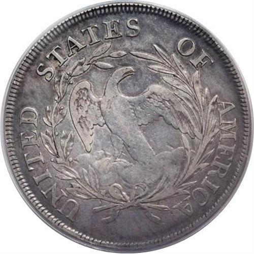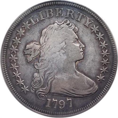 <B>1797 $1 9x7 Stars, Large Letters VF25 PCGS.</B></I> B-1, BB-73, R.3. The 9x7 obverse star arrangement, and a leaf that ends under the center of the upright of E in STATES confirm the variety of this VF25 dollar. A mix of silver and medium-gray color lays over both sides, and the design elements show nice detail. Despite a couple of obverse marks, the surfaces are remarkably clean.<BR><BR><B>Coin Engraver:</B> Robert Scot<BR><BR><b>Shipping:</b> Coins & Currency (<a target="_blank" href="http://www.heritageauctions.com/common/shipping.php">view shipping information</a>)