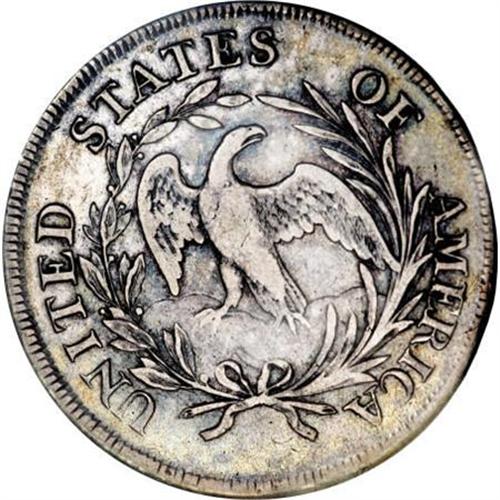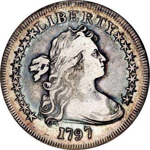 <B>1797 $1 9x7 Stars, Large Letters VF30 ANACS.</B></I> B-1, BB-73, R.3. Iridescent ruby-red, orange-gold, lilac, and aquamarine patina endows this slightly glossy mid-grade example. Surprisingly void of abrasions, although the portrait has a few faint slide marks. Only three 1797-dated die marriages are known, and each is separately listed in the <I>Guide Book</B></I>.<BR><I>From The Casa Becca del Norté Collection.</B></I><BR><BR><B>Coin Engraver:</B> Robert Scot<BR><BR><b>Shipping:</b> Coins & Currency (<a target="_blank" href="http://www.heritageauctions.com/common/shipping.php">view shipping information</a>)