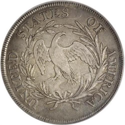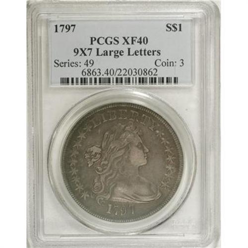 <B>1797 $1 9x7 Stars, Large Letters XF40 PCGS.</B></I> B-1, BB-73, R.3. Bowers-Borckardt Die State IV to V. Warm gunmetal gray toning with delicate blue, violet, and golden-brown iridescent highlights. Both the obverse and reverse show excellent centering and full dentilation. U.S. coins with 16 obverse stars were produced for only a brief period of time at the Mint. The 16th star commemorates the admission of Tennessee as the 16th state to the Union. In 1798, the Mint returned to its custom of using only 13 obverse stars, perhaps because it was realized that as new states were added to the Union, the plethora of new stars would start to crowd out the other design elements. Excellent quality for the grade.<BR><I>Ex: Thomas Wolfe Collection, Part One (Heritage, 9/05), lot 3655, which realized $8,050.</B></I><BR><BR><b>Shipping:</b> Coins & Currency (<a target="_blank" href="http://www.heritageauctions.com/common/shipping.php">view shipping information</a>)