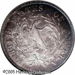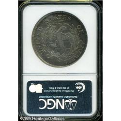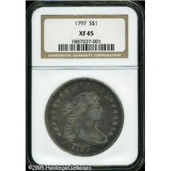 <B>1797<img border='0' src='http://www.heritagecoins.com/images/star.gif' width=10 height=10>$1 9x7 Stars, Large Letters XF45 NGC.</B></I> B-1, BB-73. A leaf tip nearly touches the C in AMERICA on this variety, one of only three known for the date. Dappled brown and sea-green iridescence overlays the otherwise silver-gray surfaces of this originally preserved example. Lightly abraded, yet sharply defined and problem-free for the grade. Lot:7314