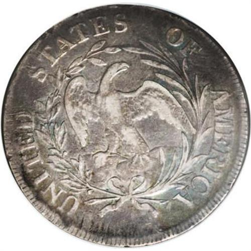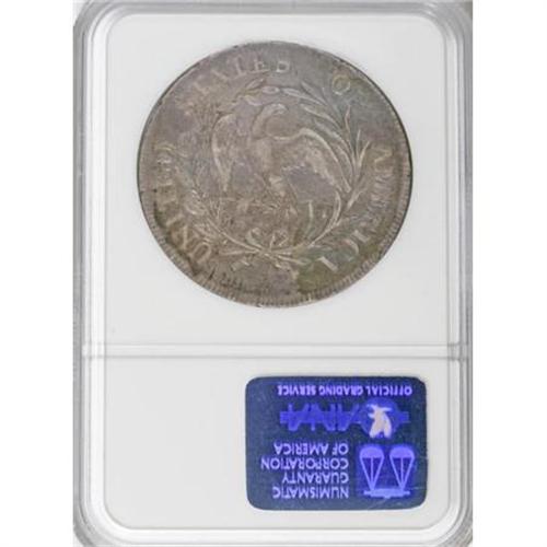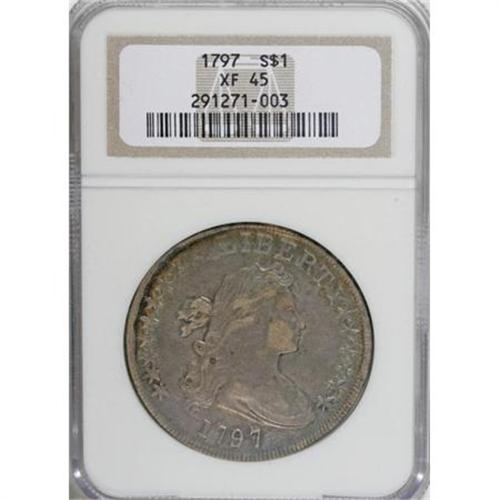 <B>1797 $1 10x6 Stars, Large Letters XF45 NGC.</B></I> B-3, BB-71, R.2. The is the only variety of the three known for the 1797 date that has 10 stars before LIBERTY and six after. Die State III, obverse and reverse die relapped. On obverse, highest wave of hair is incomplete, and stars 9 and 10 have the innermost points shortened; on the reverse, the right edges of some of the palm leaves are removed. Medium gray patination is joined by whispers of cobalt-blue, lavender, and gold at the peripheries. The design elements exhibit sharp detail, and are well centered on the planchet. A few light adjustment marks are noted in the lower left reverse quadrant, as are some small reverse rim bruises. Overall, a pleasing Choice XF early dollar.<BR><BR><b>Shipping:</b> Coins & Currency (<a target="_blank" href="http://www.heritageauctions.com/common/shipping.php">view shipping information</a>)