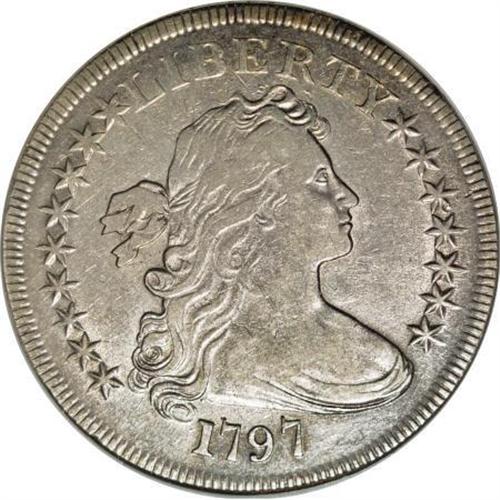 <B>1797 $1 9x7 Stars, Large Letters XF45 NGC.</B></I> B-1, BB-73, R.3. The 9x7 Stars, Large Letters variety. In his seminal 1993 work on silver dollars, Dave Bowers, through an analysis of die states, concluded that it "is likely that all specimens of 1797 BB-73 were struck at the Mint in calendar year 1798." This is an interesting point, considering that the accepted mintage figures of early coinage are often correlated to recorded delivery dates, regardless of the date on the coin. The current example is nicely detailed, well centered and, as such, a respectable representative of the date and type.<BR><BR><B>Coin Engraver:</B> Robert Scot<BR><BR><b>Shipping:</b> Coins & Currency (<a target="_blank" href="http://www.heritageauctions.com/common/shipping.php">view shipping information</a>)