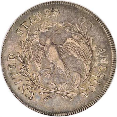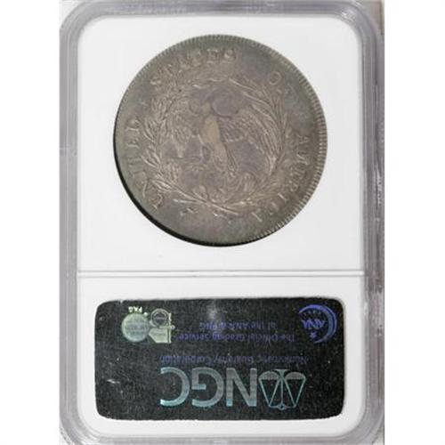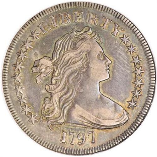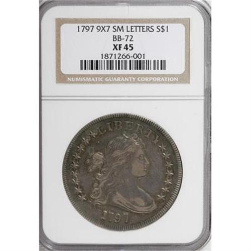 <B>1797 $1 9x7 Stars, Small Letters XF45 NGC.</B></I> B-2, BB-72, R.4. Die State I. Just the one die state of B-2 is known, with the reverse die lapped after its previous use in 1796. Most numismatists believe that about 100 to 150 of these coins survive today, although at one time the B-2 dollar was considered a major rarity. Since the days of John Haseltine and his ground breaking reference on the early dollars, this variety has been known as an elusive marriage when compared to the other two 1797 varieties. At one time, estimates as low as 20 coins were published.<BR> The present example has splendid steel-blue and pale gold toning with lighter tan color on the devices. The fields, especially on the obverse, are somewhat reflective. Just outside the Condition Census, but still highly desirable.<BR><I>Ex: Stack's (1983).</B></I><BR><I>From The Queller Family Collection of Silver Dollars.</B></I><BR><BR><b>Shipping:</b> Coins & Currency (<a target="_blank" href="http://www.heritageauctions.com/common/shipping.php">view shipping information</a>)