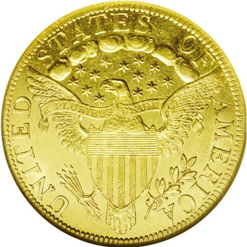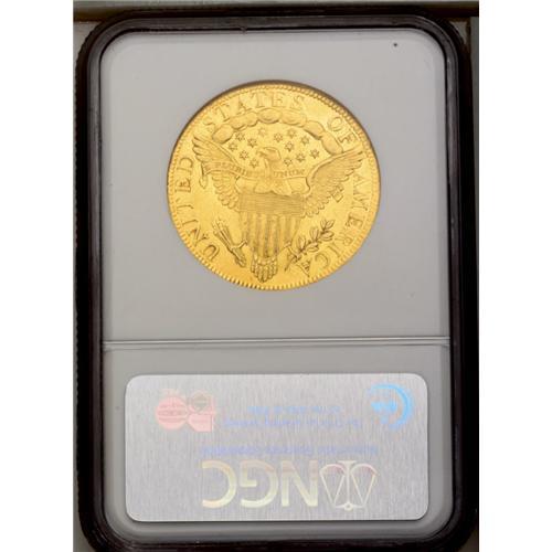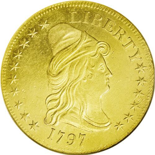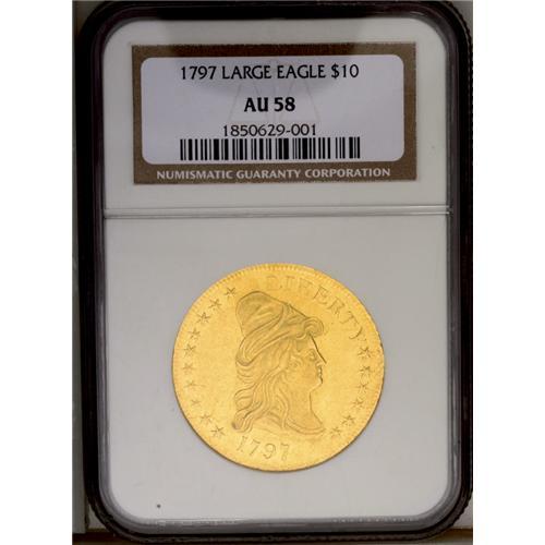<B>1797<$10> Large Eagle AU58 NGC.</B></I> Breen-6834, B. 2-C, Taraszka-12, R.4. 1797 was a transitional year for the reverse of the ten dollar piece. The Small Eagle type (B. 1-A) was presumably struck first. Three Heraldic Eagle varieties followed, all of which paired the same obverse die with three different reverses (B. 2-B, B. 2-C, B. 2-D). What makes these varieties fascinating is that each has a differently engraved eagle (apparently, a hub punch for the Heraldic Eagle had yet to be completely developed). The eagle for B. 2-B has a thin neck and tongue. The B. 2-D eagle has a short neck and no tongue. Finally, the eagle for B. 2-C has a triangular neck and a thick tongue. The present piece is from the usual die state for the variety, with a light vertical crack from the rim across the second 7 in the date to the bust, and a second light crack on the reverse between the rim and the olive branch across the C in AMERICA. Slight wear is evident on Liberty's forehead and shoulder, on the hair above the ear, and on the cap above the forehead. On the reverse, traces of wear are limited to the centers of the clouds, and the highpoint of the eagle's right (facing) wing, just right of the scroll. The breast feathers are fully present, an indication of the near-Mint grade since these quickly wear on circulated examples. Luster dominates all legends and devices, and is diminished only across the open fields. This crisply struck piece does not have any rim nicks, and in fact there are no relevant marks whatsoever. A hair-thin horizontal mark across obverse star 14 is mentioned solely as an identifier for any future auction appearances. The obverse border between 2 and 3 o'clock shows light adjustment marks of mint origin. These do not extend past the denticles, and have only marginal impact on the eye appeal.