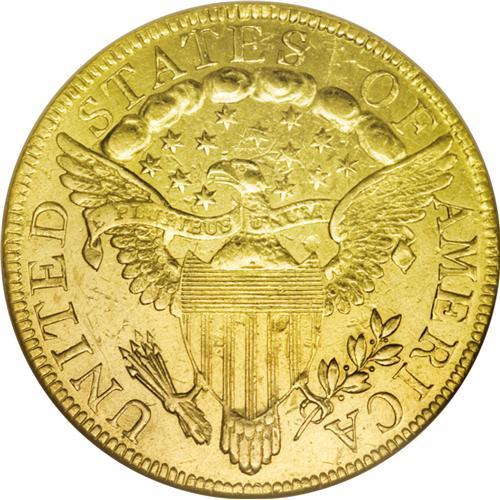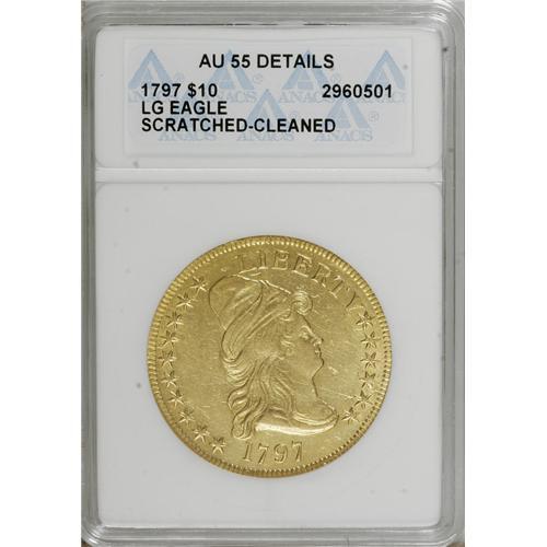 <B>1797 $10 Large Eagle--Scratched, Cleaned--ANACS. AU55 Details.</B></I> Breen-6834, BD-2, High R.4. Bright greenish-gold surfaces exhibit numerous fine scratches in the fields, the result of this piece being improperly cleaned. The Mint produced three different varieties of 1797 Heraldic Eagle tens, all from a common obverse die. Approximately 250 examples are thought to survive from all three die combinations, with 80 to 100 being this BD-2 variety. This is an excellent candidate for the date collector, or for the first year of issue type collector.<BR><BR><b>Shipping:</b> Coins & Currency (<a target="_blank" href="http://www.heritageauctions.com/common/shipping.php">view shipping information</a>)
