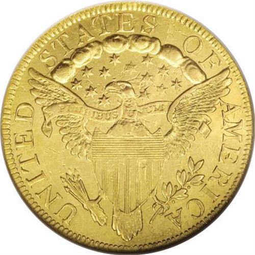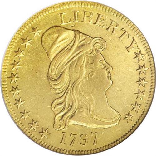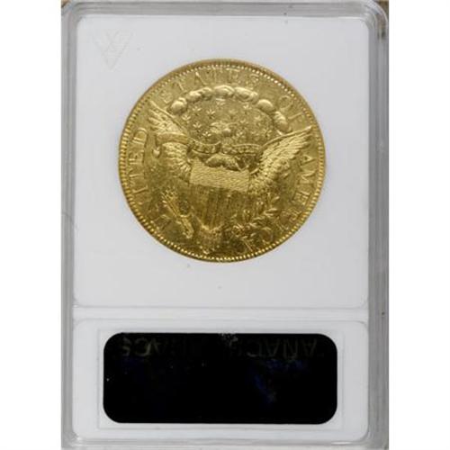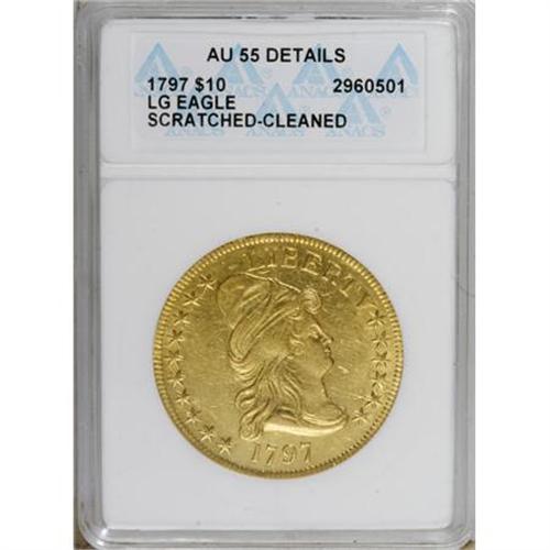 <B>1797 $10 Large Eagle--Scratched, Cleaned--ANACS. AU55 Details.</B></I> Breen-6834, Taraszka-8, BD-2, High R.4. The eagle has a lengthy, narrow neck on this scarce die variety. Careful rotation beneath a light reveals faint hairlines across both sides, and a hair-thin pinscratch crosses Liberty's neck. But the reverse has nearly full luster, and obverse luster fills the border and hair. A few faint adjustment marks are present on the right obverse field.<BR><BR><b>Shipping:</b> Coins & Currency (<a target="_blank" href="http://www.heritageauctions.com/common/shipping.php">view shipping information</a>)